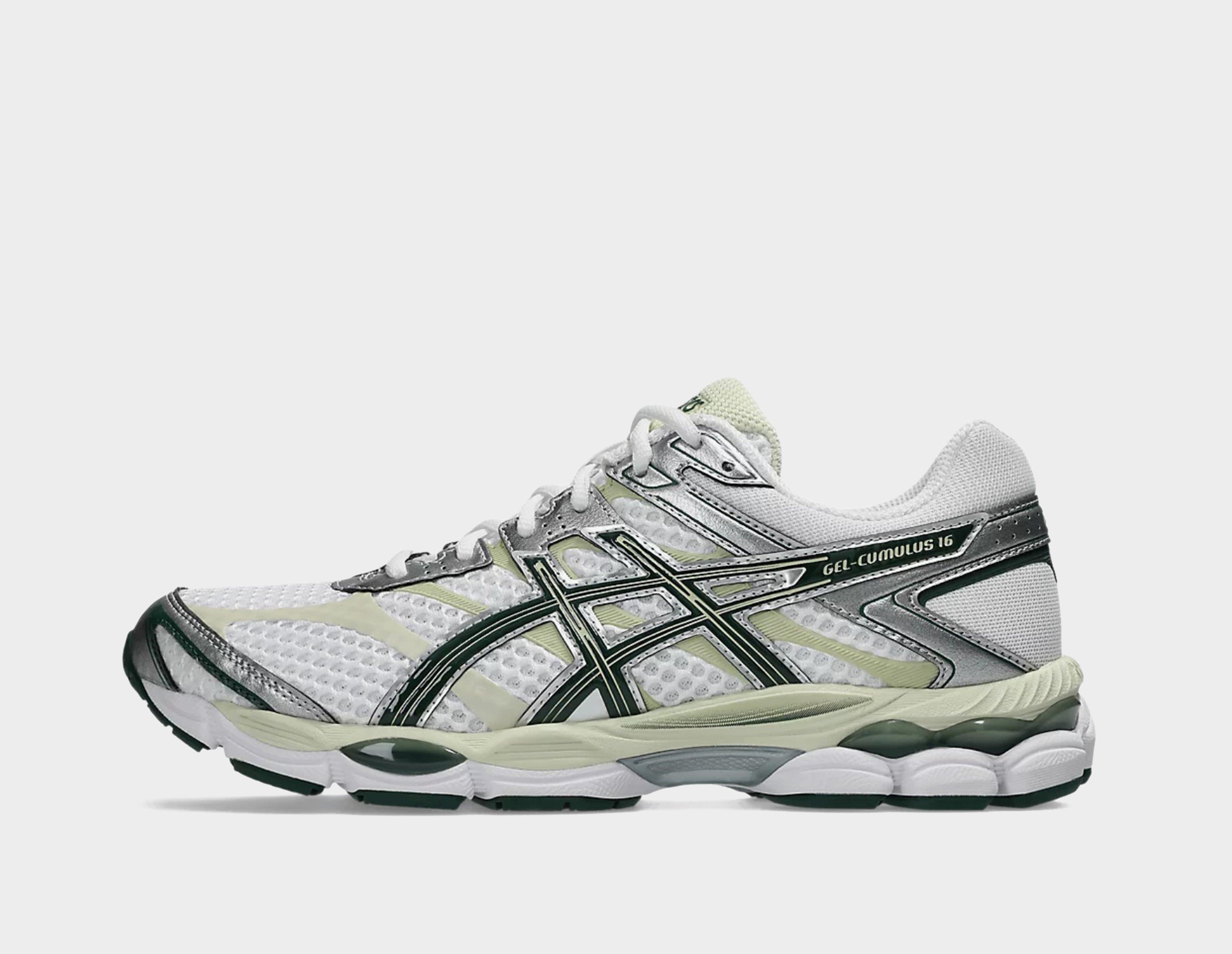 Originariamente lanciata nel 2014, la ASICS GEL-CUMULUS 16 è rinomata per il suo design ispirato alle scarpe da running degli anni 2010 e per il suo comfort. La tomaia presenta una base in mesh bianco a trama aperta, stratificata con pelle sintetica color argento e "Forest Night", pannelli senza cuciture e gabbia ASICS sul lato. Sotto, due inserti GEL ammortizzanti offrono un comfort duraturo, mentre le tecnologie FLUIDRIDE e FLYTEFOAM assicurano una corsa fluida. | 1203A733.105